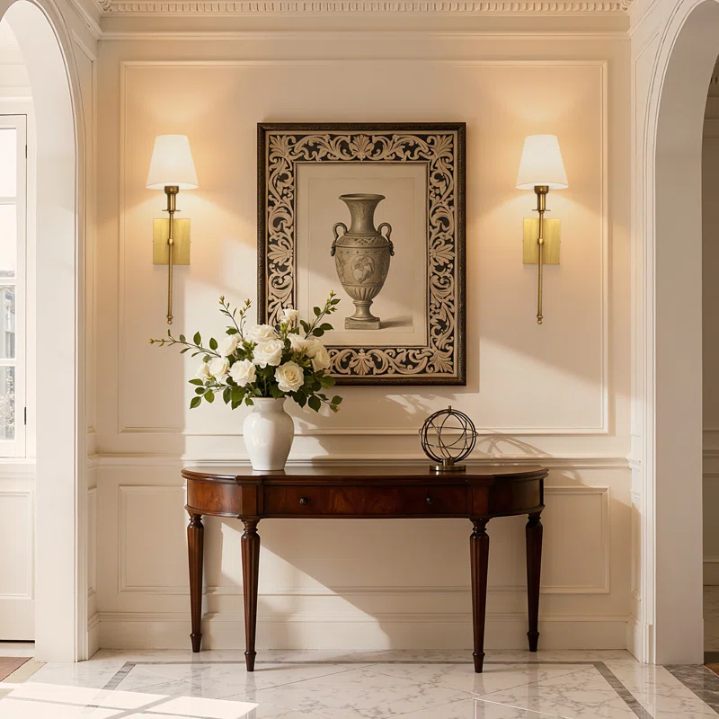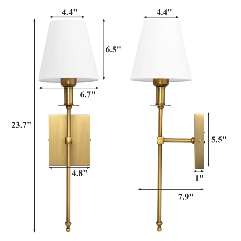 Bring timeless sophistication to your home with this elegant wall sconce set. Featuring a delicate torch-inspired arm and gracefully flared white fabric shade, it will illuminate your living spaces with style. With an all-natural design aesthetic, it brings organic elegance to hallways, bedrooms and living spaces. Constructed from premium iron with a durable finish, the fixture offers reliable heat-resistant performance and can safely accommodate bulbs (not included) of up to 60W. Available in three refined finishes — Brushed Brass, Matt Black and Satin Nickel — it will blend seamlessly into your existing décor. The neutral white shade diffuses soft, inviting light and is easily maintained with simple dusting. Designed for hardwiring and complying with U.S. electrical standards with ETL certification, it transitions beautifully from traditional to contemporary interiors, creating warm ambient lighting that enhances any atmosphere.